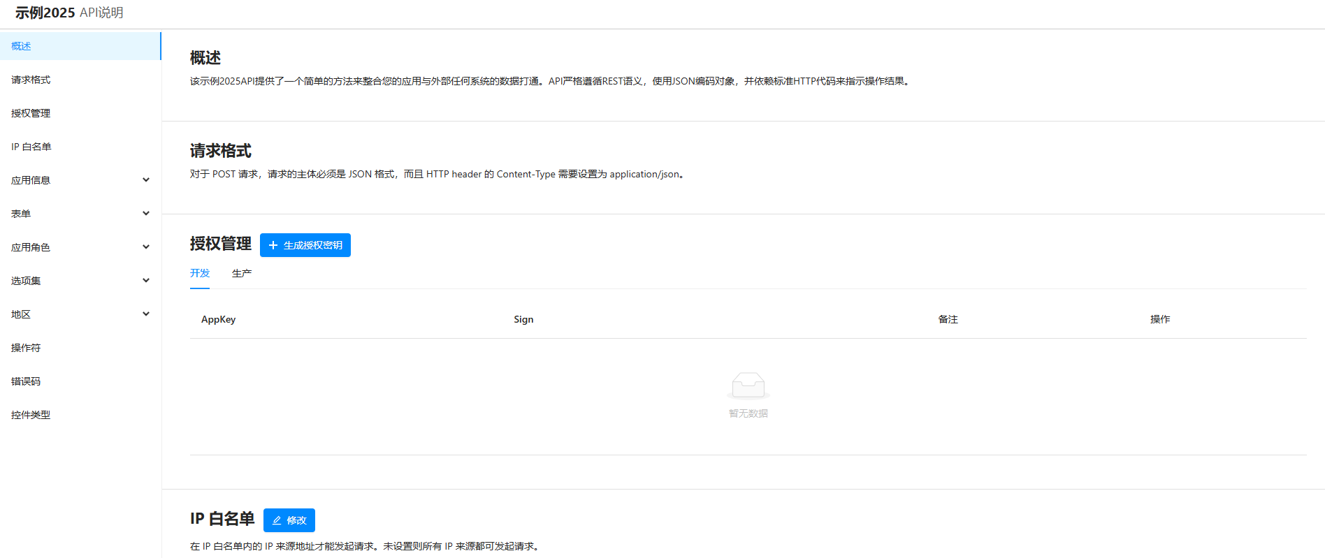 每个应用创建后,会自动创建对应的API接口,应用管理员可查看接口文档,也可以将接口文档分享给开发者。