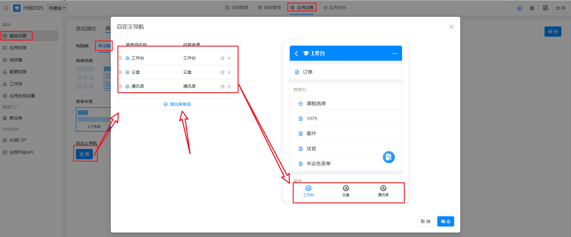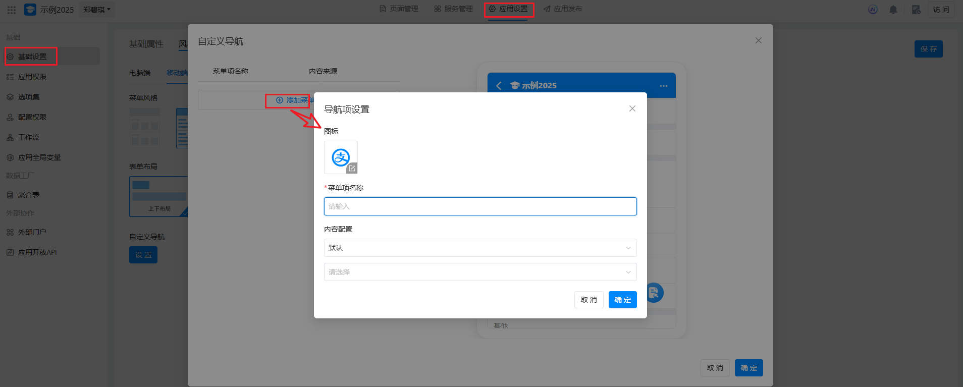 应用名称,主题色及图标,菜单风格,表单默认布局方式以及整个应用自定义按钮设置