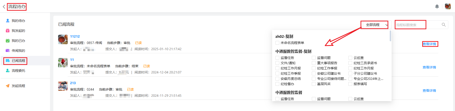 如果是流程中心的的「已阅流程」流程搜索,则搜索范围为整个企业的「已阅流程」流程。如下图所示: