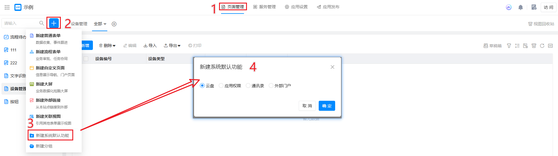 2)非空应用:对于非空应用,在页面管理,点击【+】号即可创建表单,如下图所示