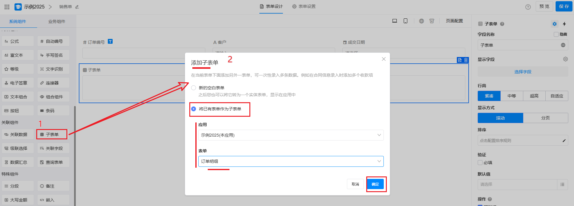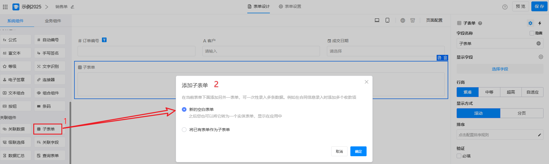 - 进销存场景中,一个订单中会记录多款产品,可以通过子表单设计订单明细等;