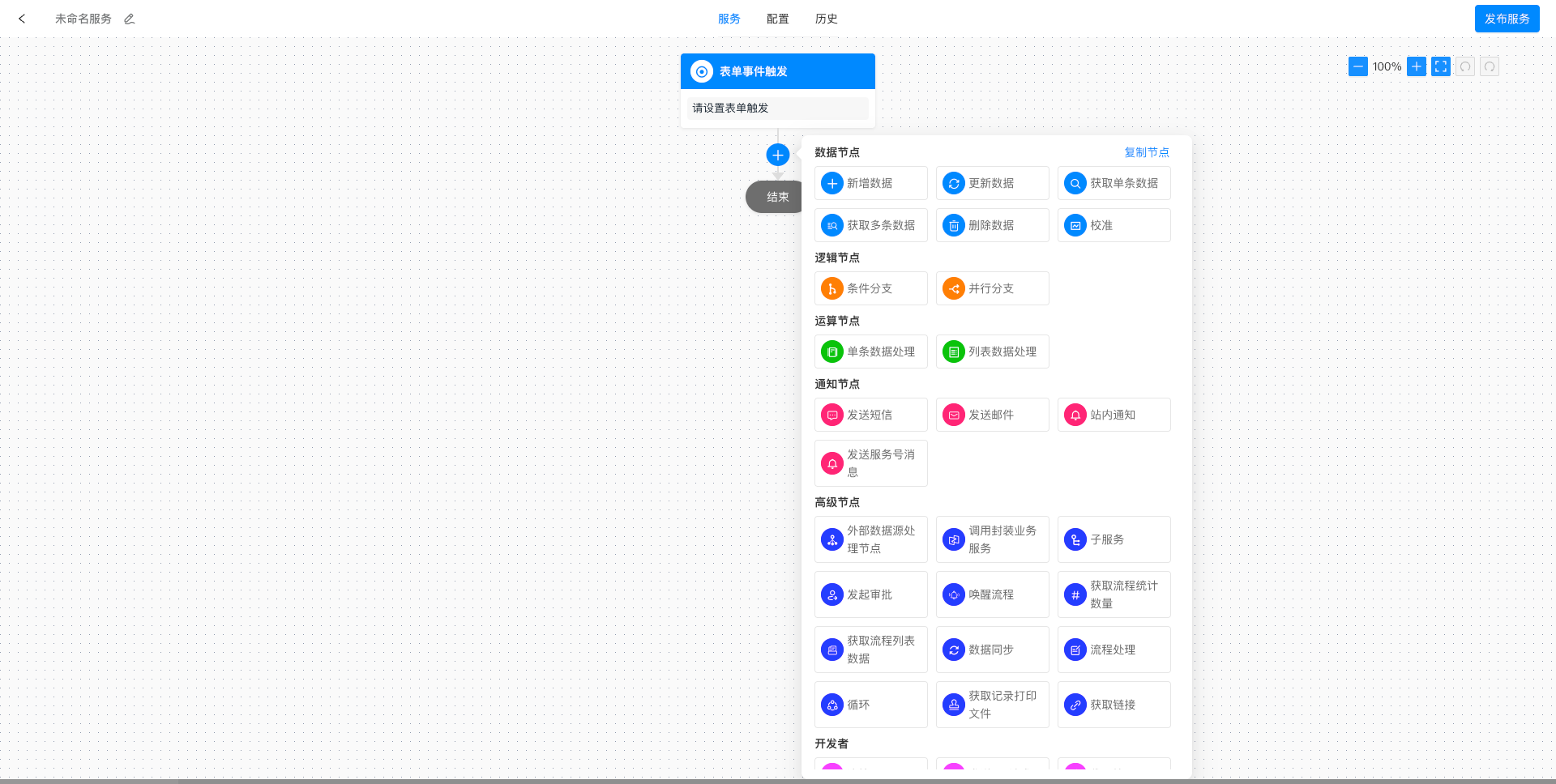 根据业务需求,在服务中添加相应的功能节点。常用的功能节点包括: