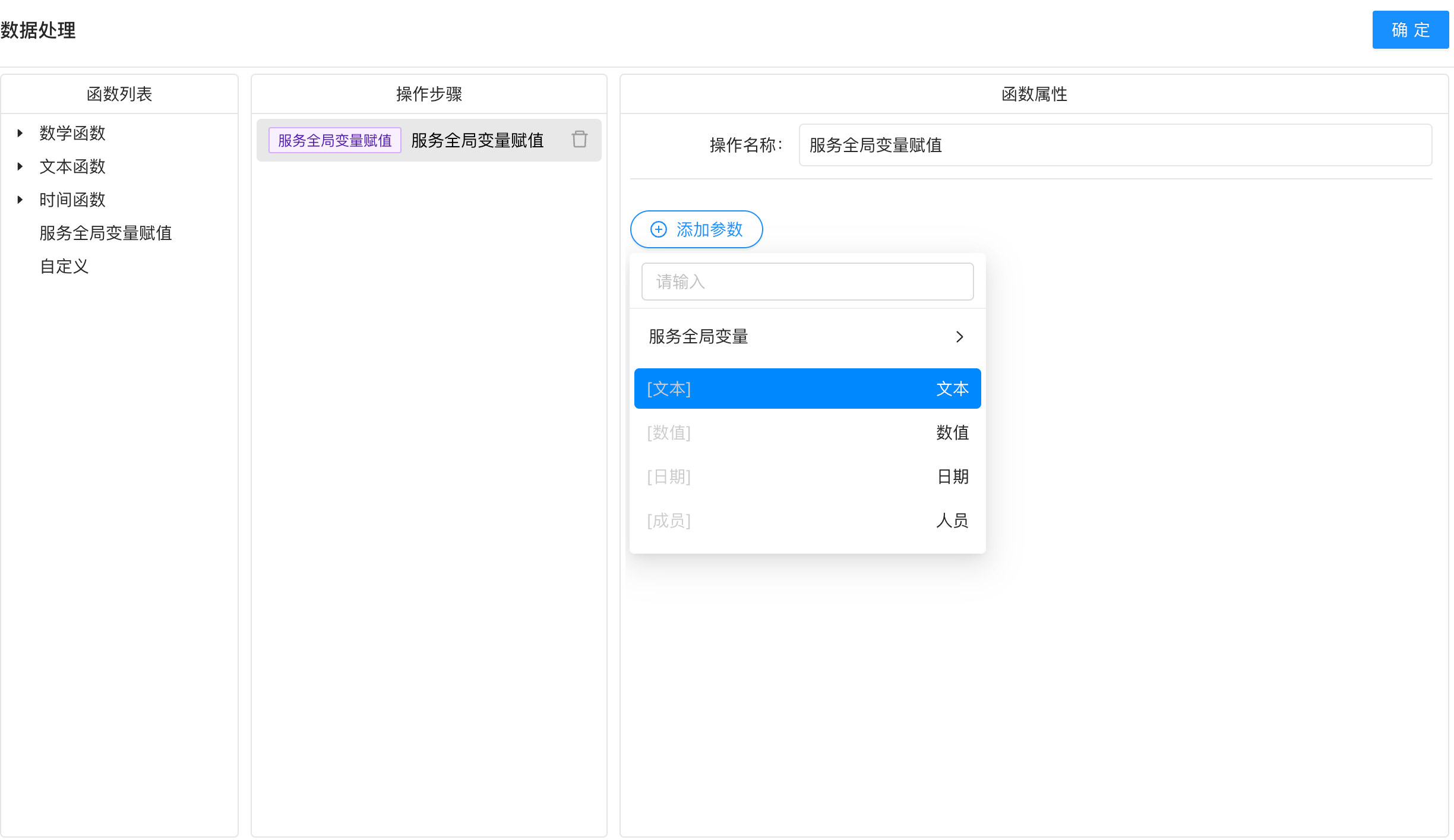 在服务中定义一个参数对象,就像一个临时的服务字段一样,可以存放某个字段值,或计算结果,或接收其他服务中传过来的值,然后被其他节点引用。 服务运行结束后,参数值会被清空重置。