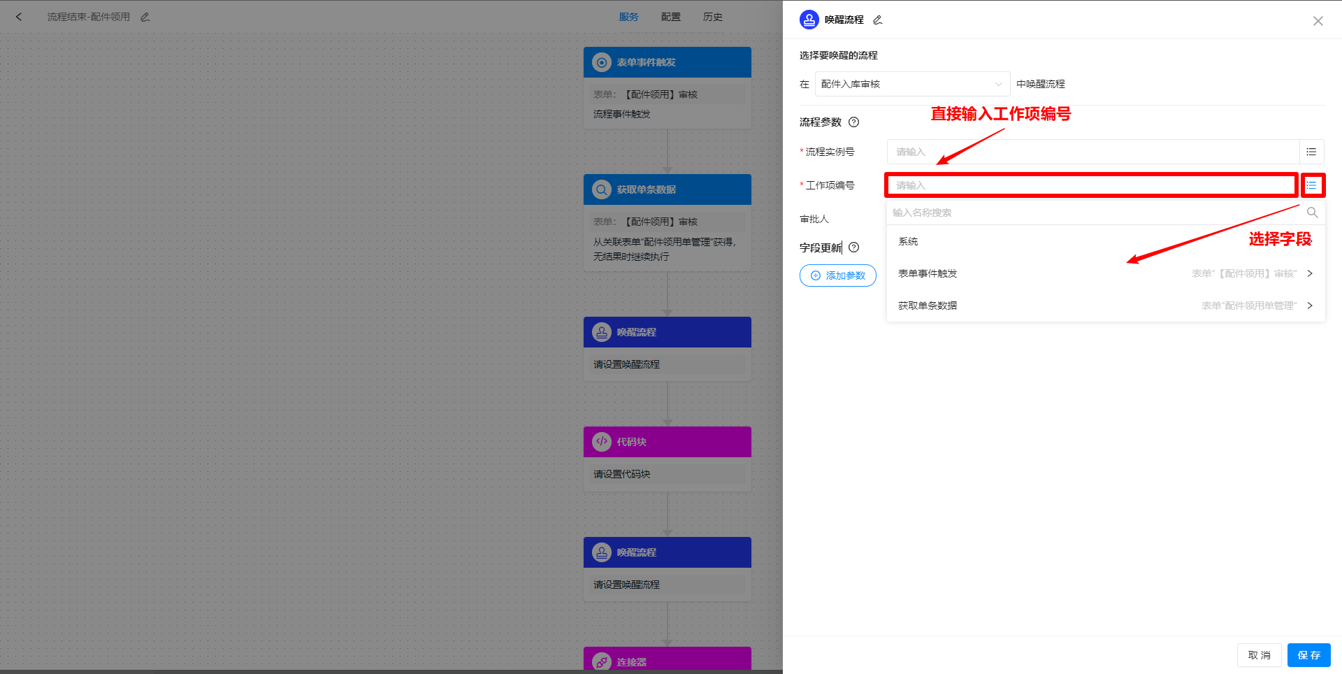 • 步骤3:工作项编号:设置「配件入库审核」流程里面具体的工作项编号,即流程走到了哪一步,可以设置固定值,也可以点击最右边的按钮选择节点字段; 设置工作项编号