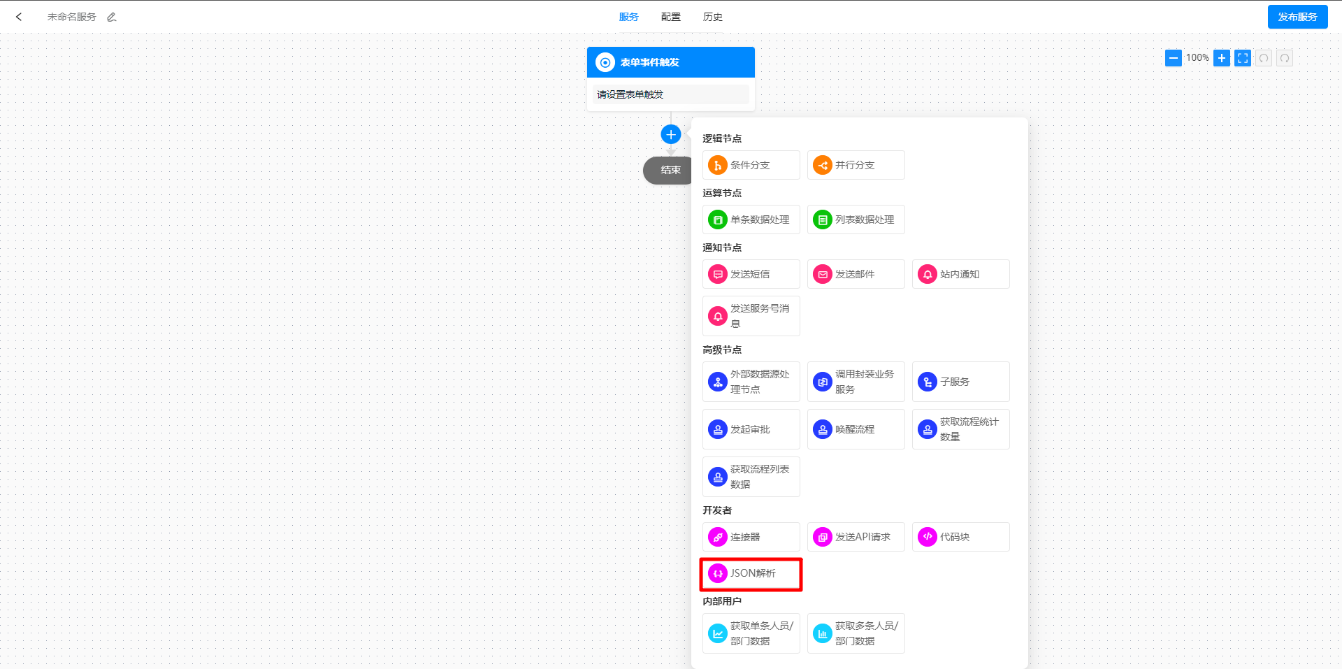 - 在流程线上点击 「+」,选择 「JSON解析」 节点。