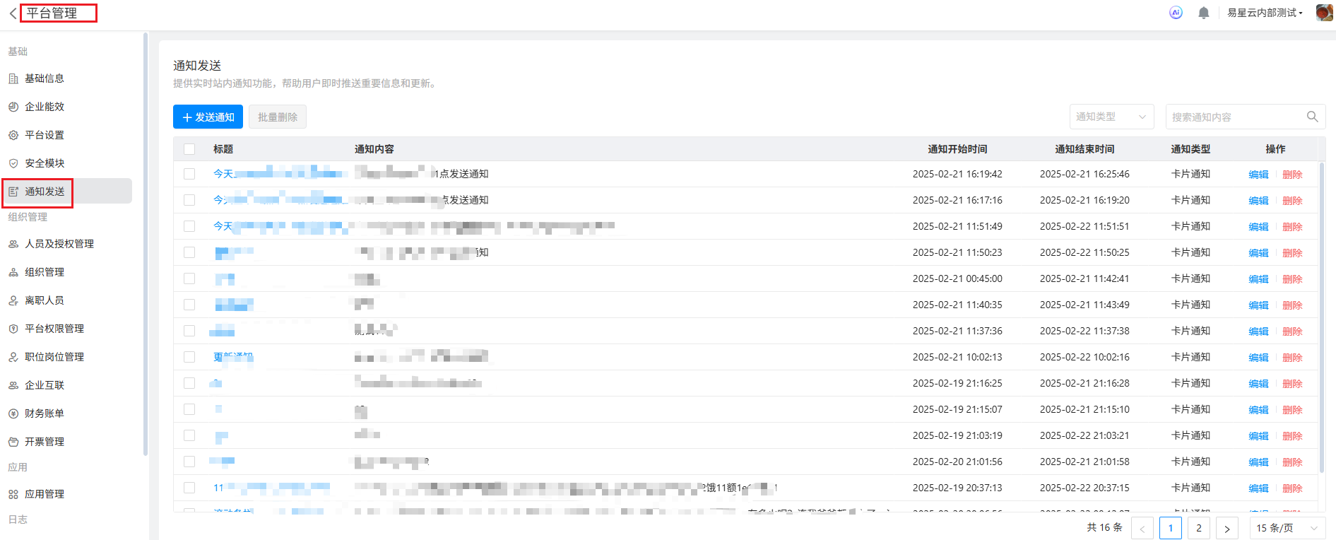 平台管理员点击「 首页 》平台管理 》通知发送 」进入通知发送页面。
