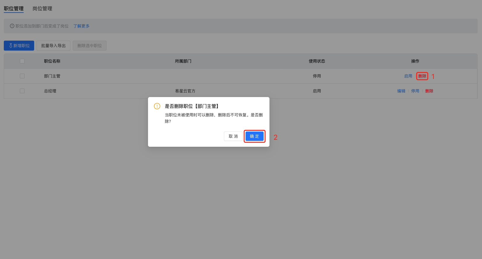 在职位列表的右侧操作栏,点击“删除”按钮,打开职位删除确认框,点击“确认”删除职位。