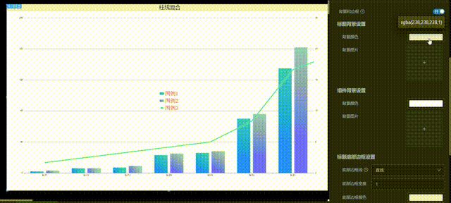 在样式中可以设置组件的「柱状图类型、柱体、标签线设置」、「折线图类型、标签线设置」、「线条发光设置」、「线点标记设置」、「X轴和分割线设置」、「Y轴和分割线设置」、「图形边距设置」、「组件属性」、「标题属性」、「图例属性」、「背景和边框」、「图表配色」、「Tooltip样式配置」