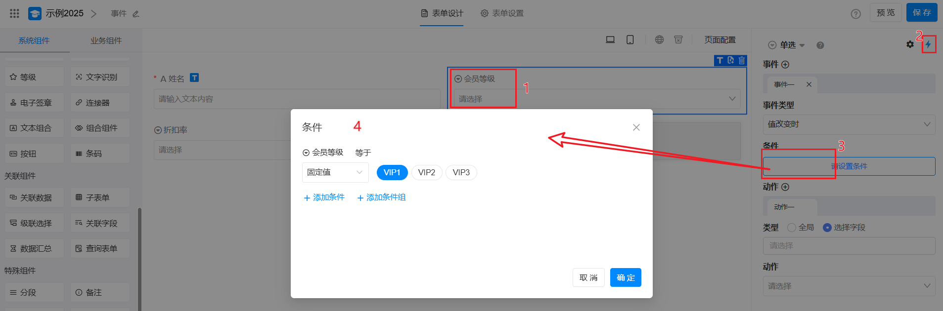 - 选择字段动作:针对特定字段进行操作,如显示、隐藏、启用、禁用以及设置字段值等。这些操作允许用户根据业务需求动态调整字段的状态或内容。例如,可以根据条件控制“折扣率”字段的显示或隐藏,或者为其设置特定的值。
