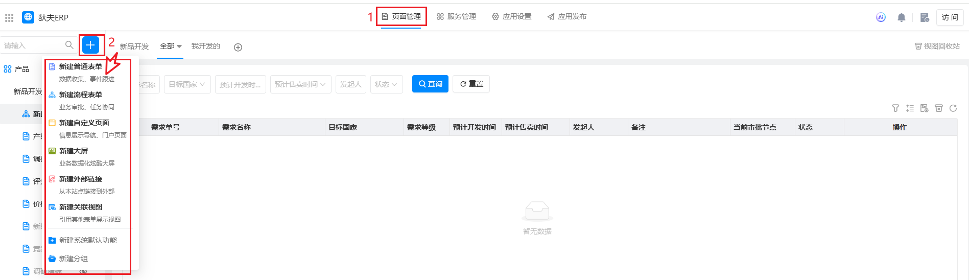2)非空应用:对于非空应用,在页面管理,点击【+】号即可创建表单,如下图所示