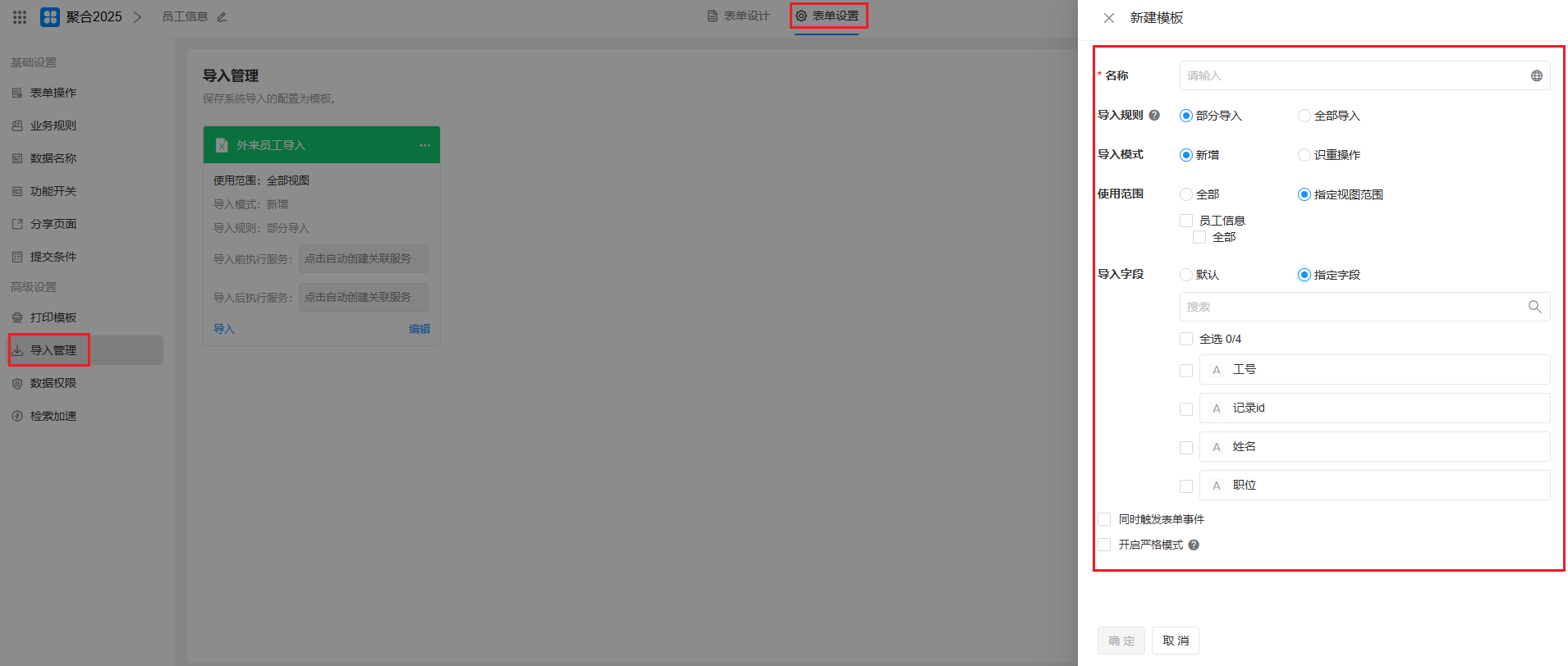应用搭建表单管理表单设置导入管理On this page导入管理 不同业务场景或企业往往对导入格式有不同的要求:有时需要的导入字段内容不同,我们可以将配置好的格式保存为模板,导入时直接选择导入设置即可。 设置入口 设置路径「 表单设置 》导入管理 》」。