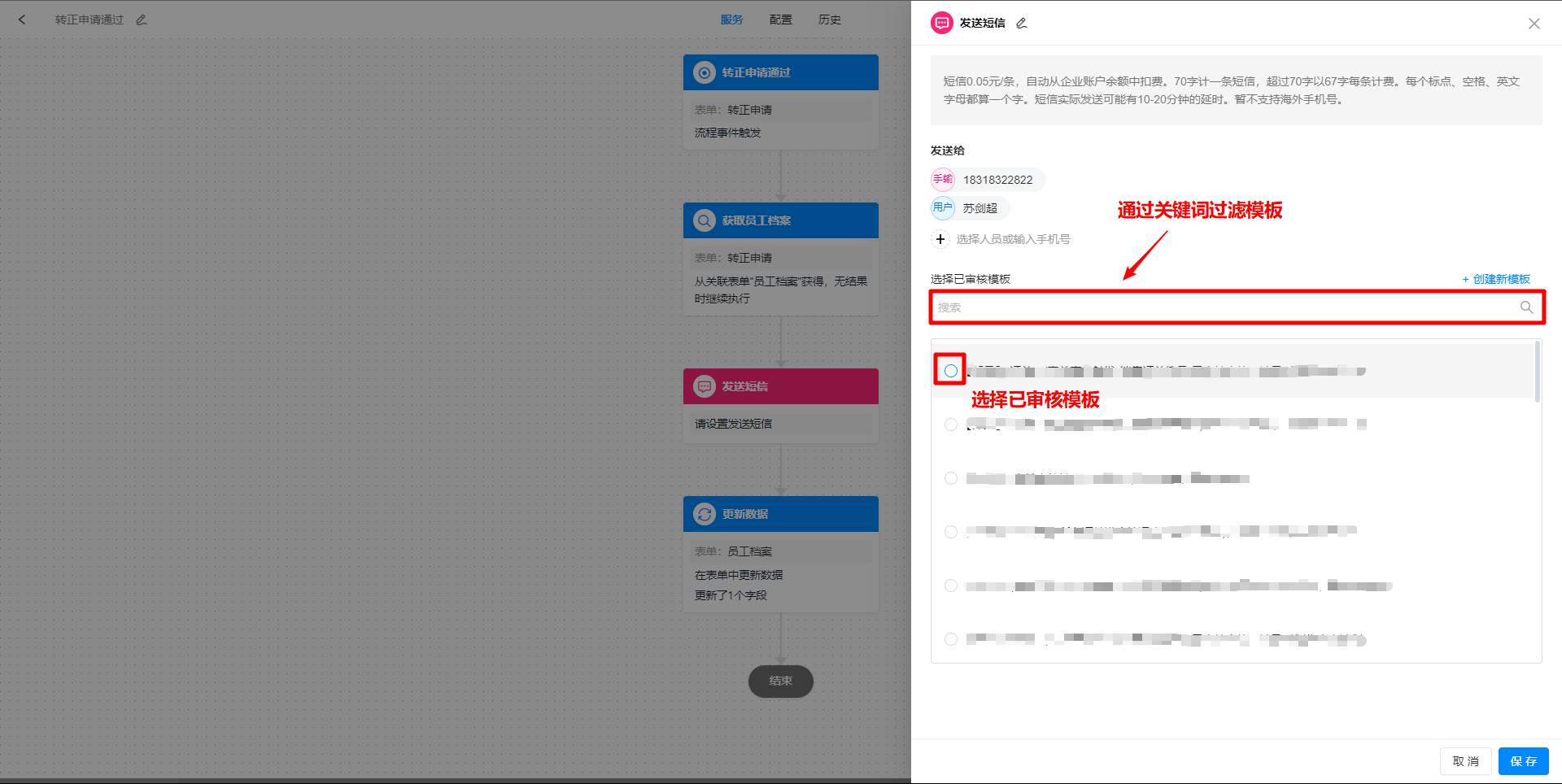 • 步骤4:设置完手机号和已审核模板后,点击「保存」按钮即可。这样当流程进入到「发送短信」节点后,系统会自动给设置的相关手机号发送短信。