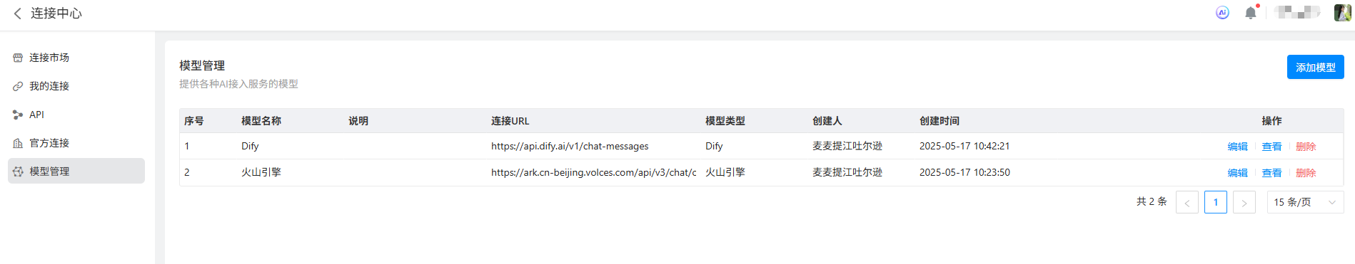 我的应用 > 连接中心 > 模型管理 - 界面展示现有模型列表,提供添加、编辑、删除等操作功能