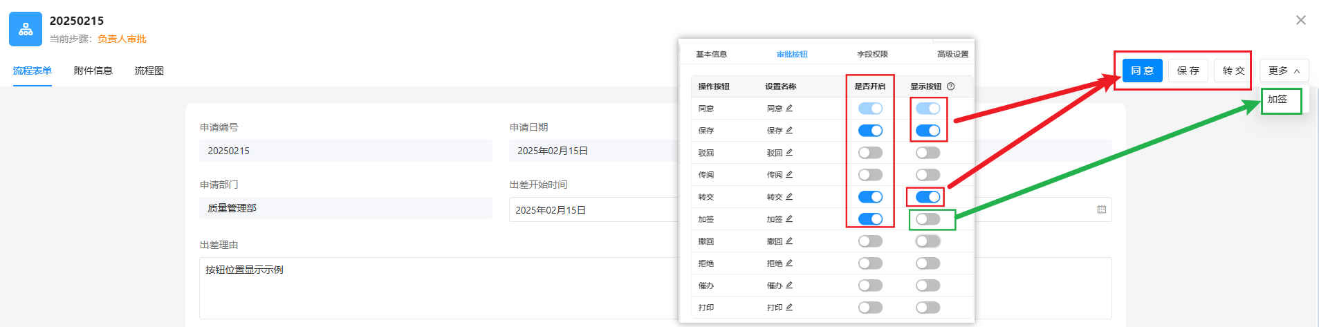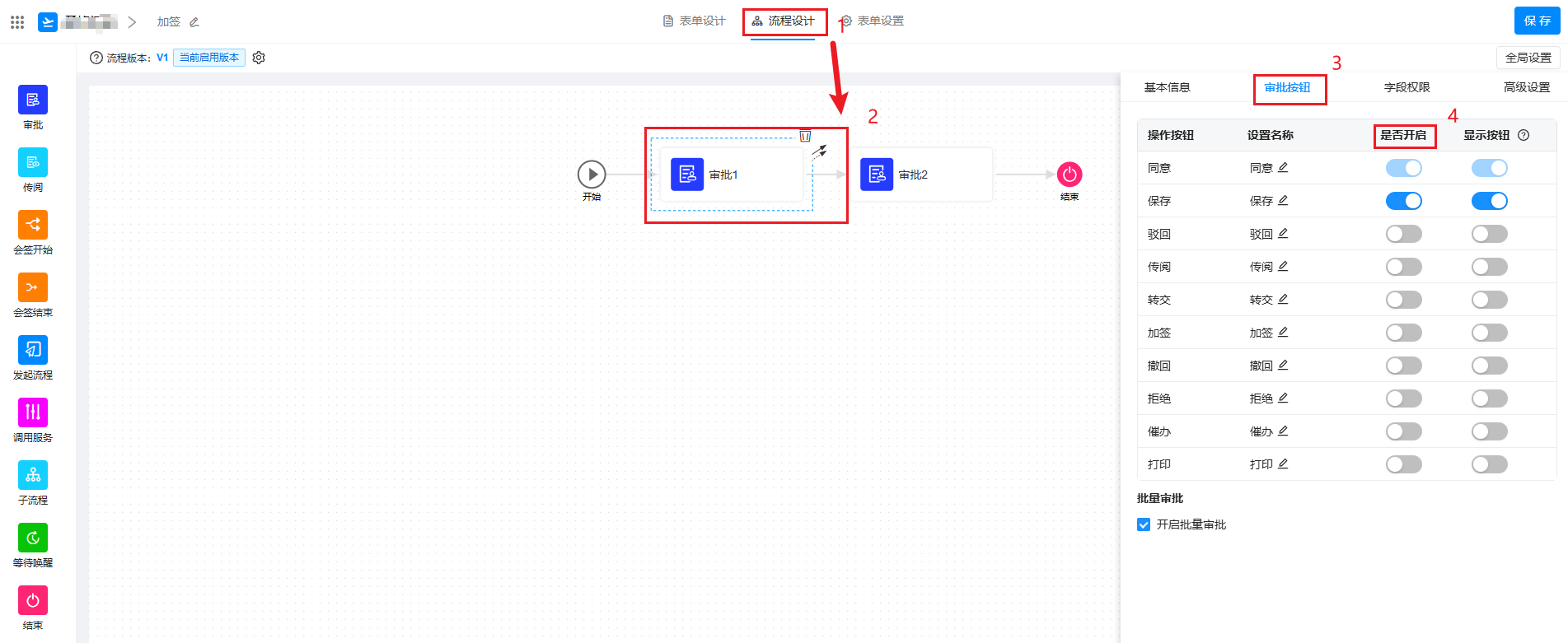 进入「流程设计」,选中流程节点,在「节点属性 >> 审批按钮」处,开启所需操作按钮。