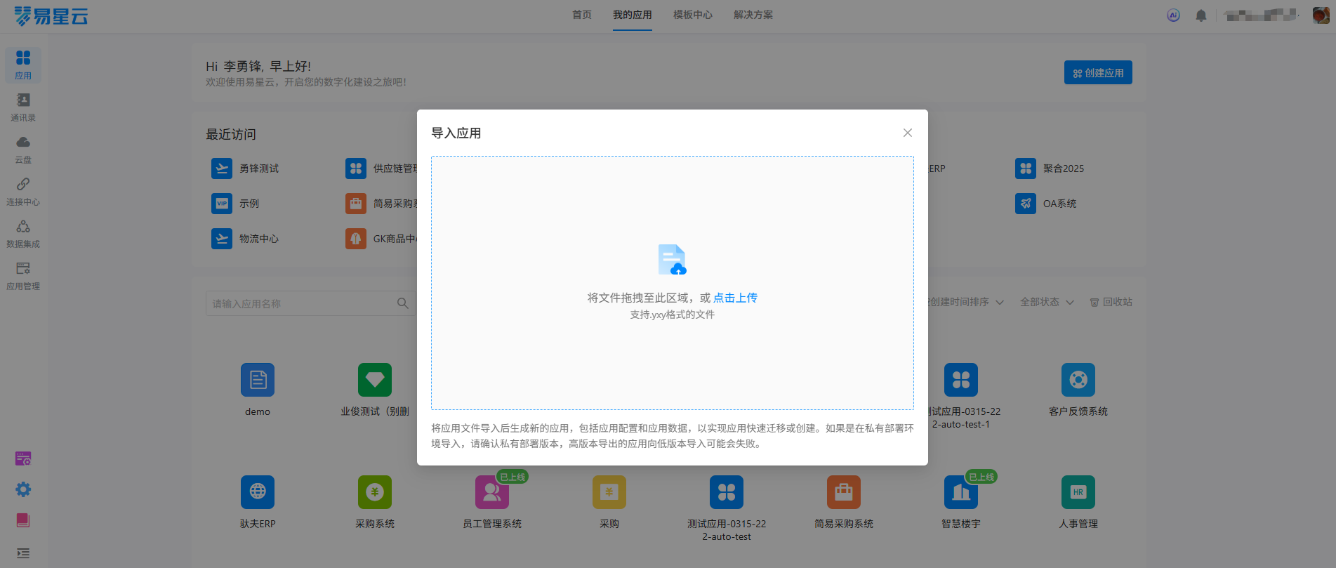选择导入应用文件,弹窗导入应用上传窗。把要导入要上传应用即可。
