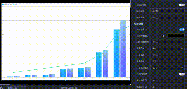 在样式中可以设置组件的「柱状图类型、柱体、标签线设置」、「折线图类型、标签线设置」、「线条发光设置」、「线点标记设置」、「X轴和分割线设置」、「Y轴和分割线设置」、「图形边距设置」、「组件属性」、「标题属性」、「图例属性」、「背景和边框」、 「图表配色」、「Tooltip样式配置」