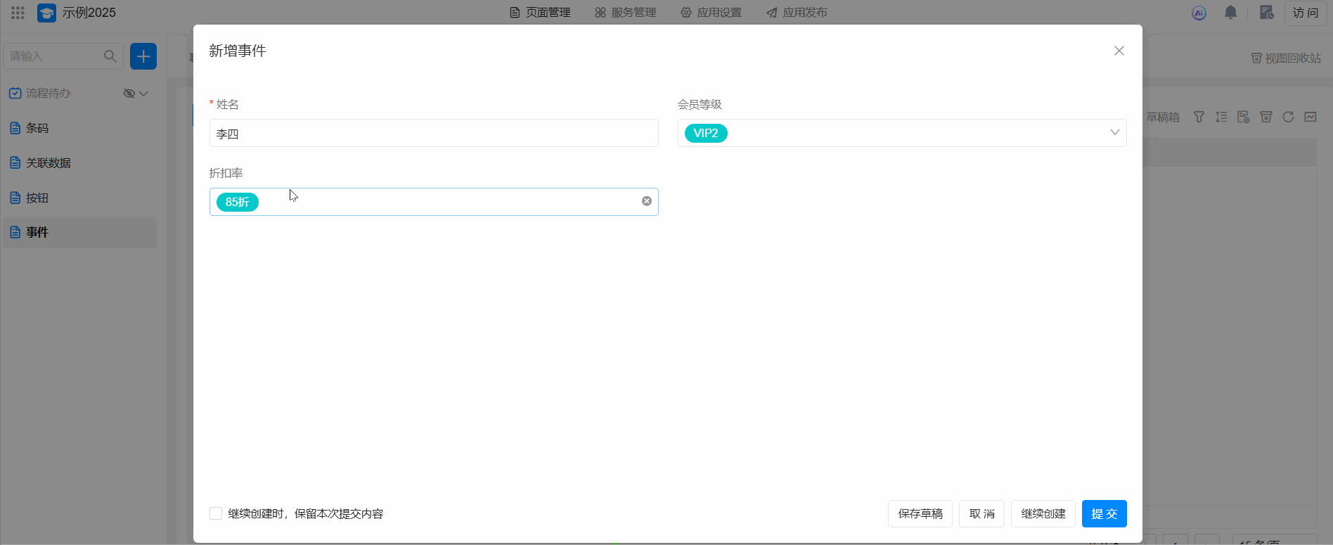 在详情页创建记录或编辑记录时,支持自定义控件事件。在控件上有交互事件发生时,如果表单内的数据满足条件,则可以根据配置执行不同动作,如提醒、调用集成API等。