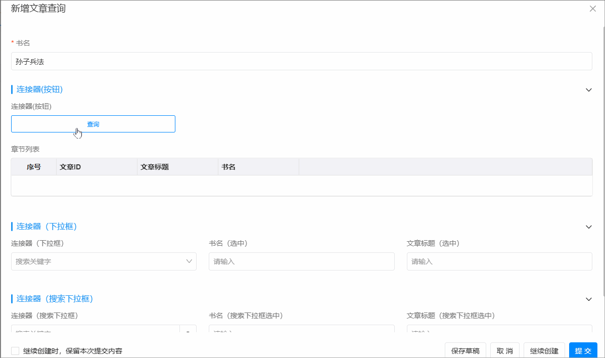 连接器控件显示方式有三种类型:按钮、下拉框、搜索下拉框