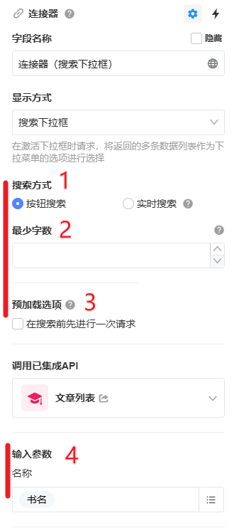 - 最少字数: 当输入满足了最小字数后才会发起请求,当API的搜索参数有字数限制时可以设置此配置