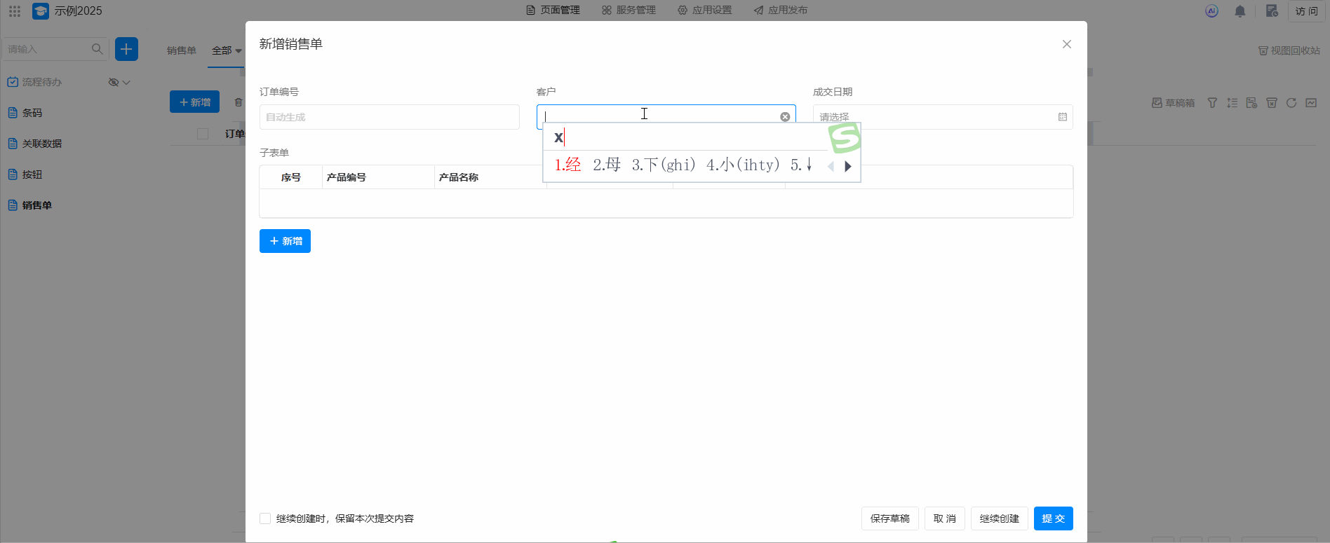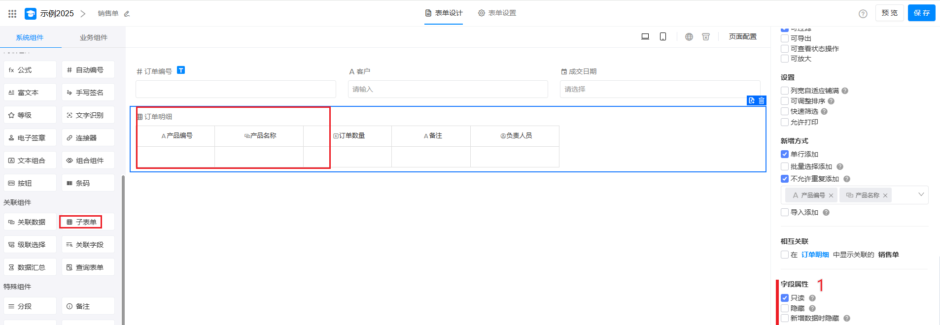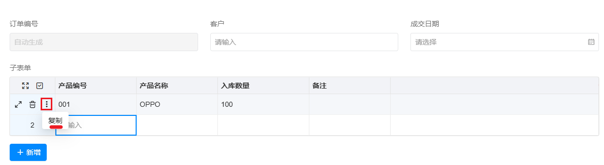 - 进销存场景中,一个订单中会记录多款产品,可以通过子表单设计订单明细等;
