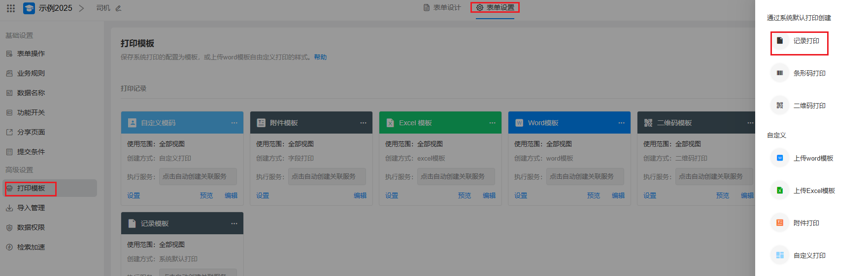 进入表单编辑页面 > 表单设置 > 打印模板 > 新建模板 ,选择"记录打印",开始创建记录的系统打印模板。