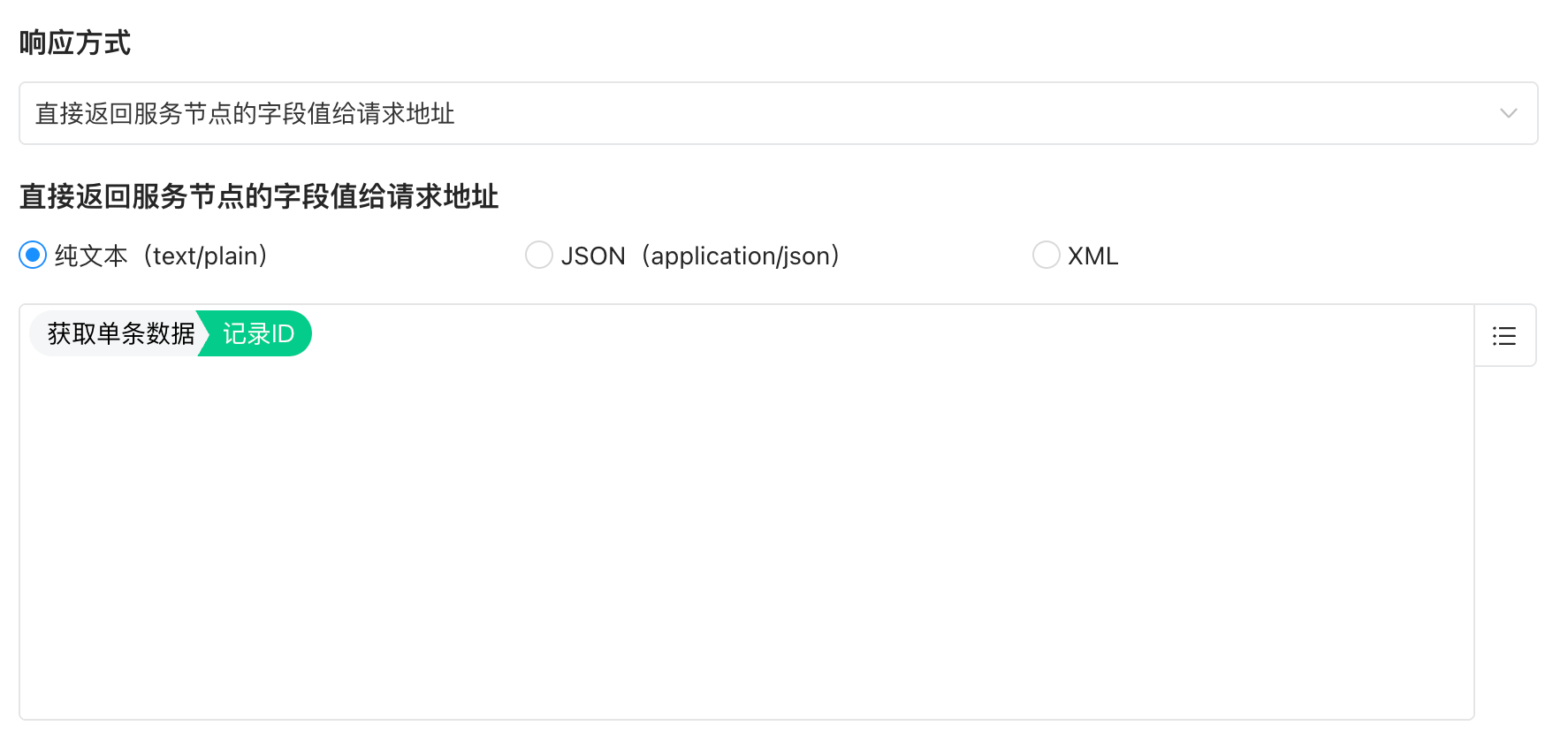 - **直接返回服务节点的字段值給请求地址:**将所选节点的字段值结果立即返回給请求方,支持选择返回格式,服务执行时间30s以内