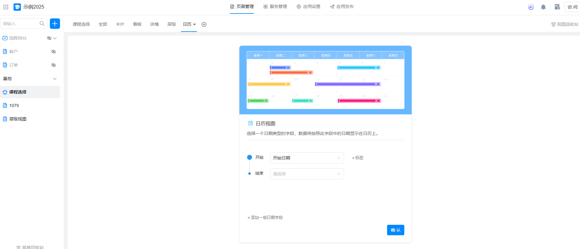 日历视图中,至少且必须要有一个日期字段作为“开始”,作为组成日历的日期线。如果您的业务需要有严格的计划,例如任务的开始和结束时间,则可以选择另一个日期字段作为结束。