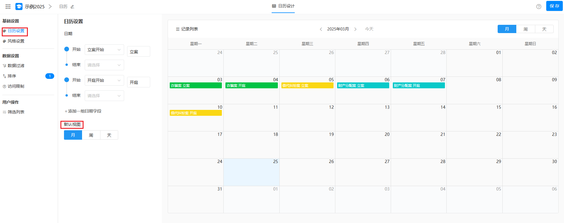选择一个单选项字段,数据将按照此字段中的选项颜色来标记日程中记录的颜色,便于区分数据类型。 效果如下: