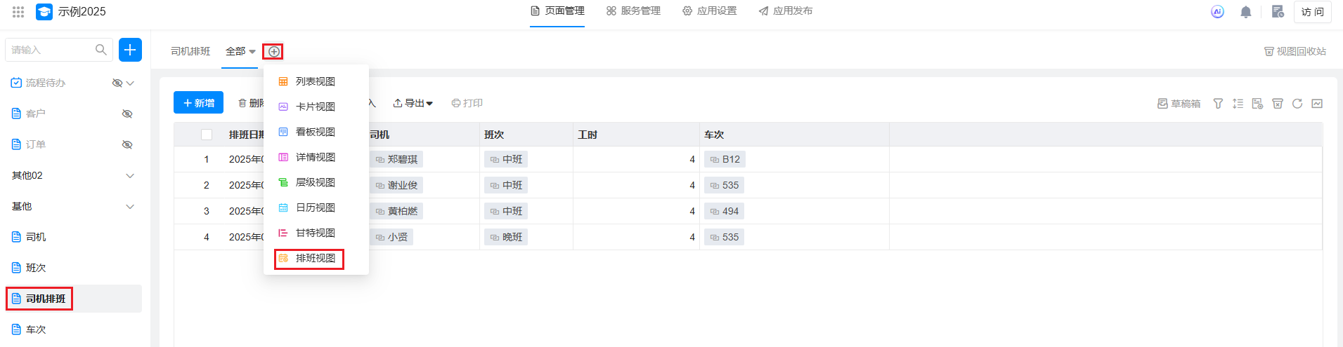 在视图栏上面的「 + 」 按钮,选择视图类型(排班视图)。