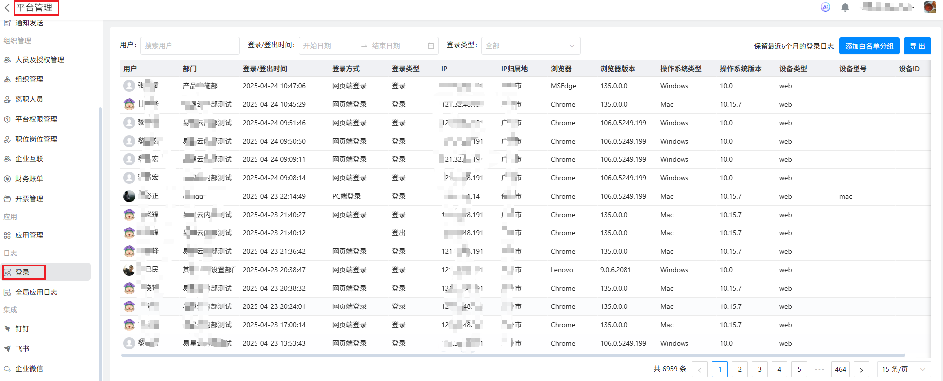 平台管理日志登录本页总览登录 登录日志记录的是企业成员的登录明细情况,记录了登录人、登录时间、登录地、登录平台以及登录的 IP 地址。 注:登录日志仅保留最近 6 个月的日志。 应用场景 企业成员通过登录日志查看登录时间等明细信息; 成员账户登录出现异常时,通过登录日志排查原因。 演示效果 通过登录日志,查看成员登录的相关记录。 功能路径 平台管理员点击「 首页 》平台管理 》登录 」进入登录页面。 查询 登录日志可以根据登录人,登录/登出时间和来登录类型查询。如下图所示: 登录白名单