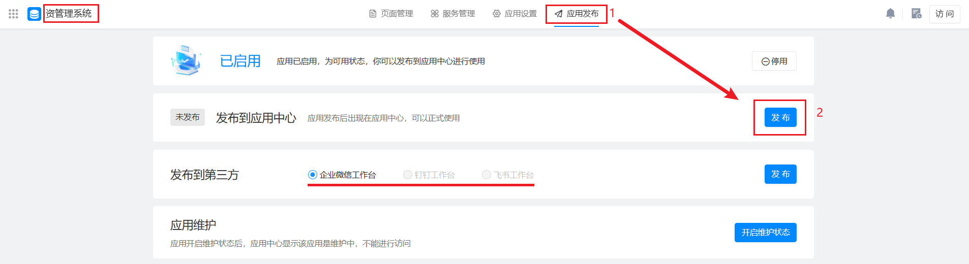 应用搭建完成后,需要将应用发布到应用中心提供给企业内部人员使用。