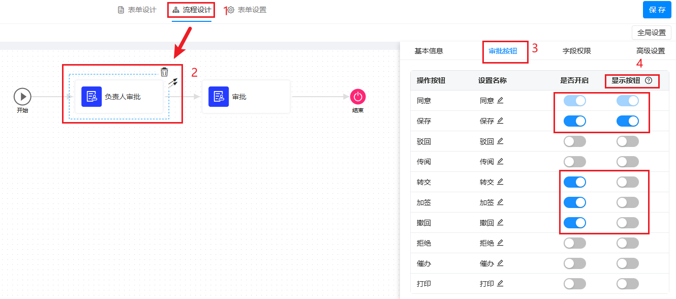 进入「流程设计」,选中流程节点,在「节点属性 >> 审批按钮」处,开启所需操作按钮。